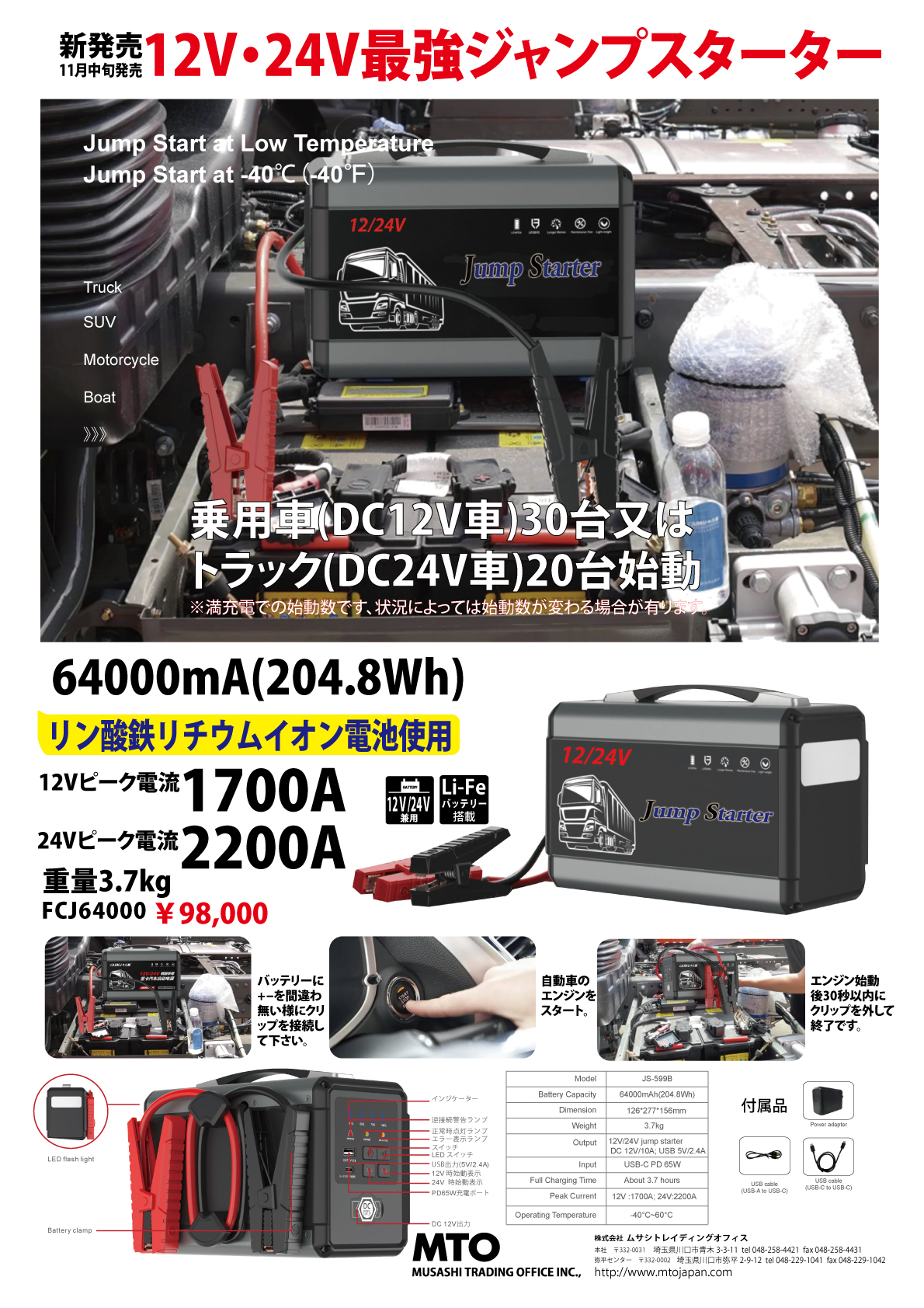 小型・軽量。DC12Vエンジンスタート時は最大出力電流1200A、始動電流600A。